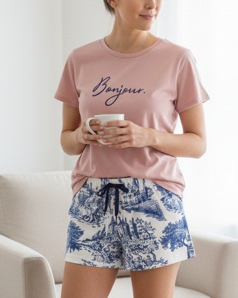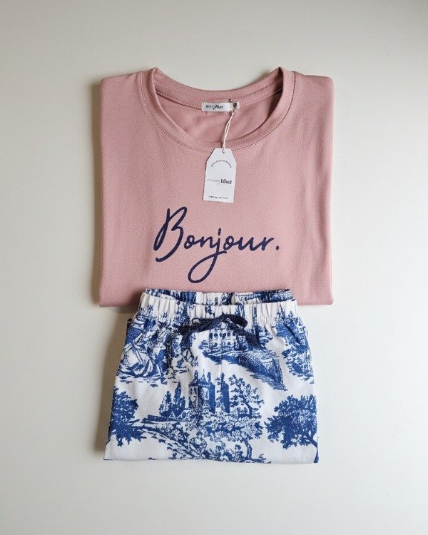 Remera color Rosa con estampado Bonjour + short estampado ideal para tus momentos de relax.