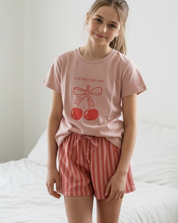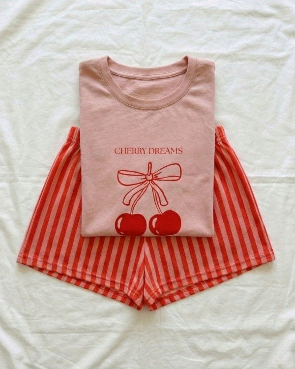 Remera color Rosa 100 % algodón con estampado Cherry Dreams + short con bolsillos modal soft estampado rayas rojo y rosa... ideal para tus momentos de relax.