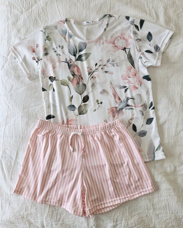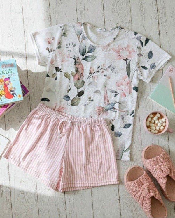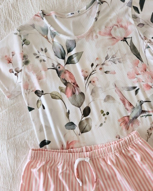 Remera m/ corta estampado colibrí confeccionado en morley soft + short rayado modal soft, ideal para tus momentos de relax.