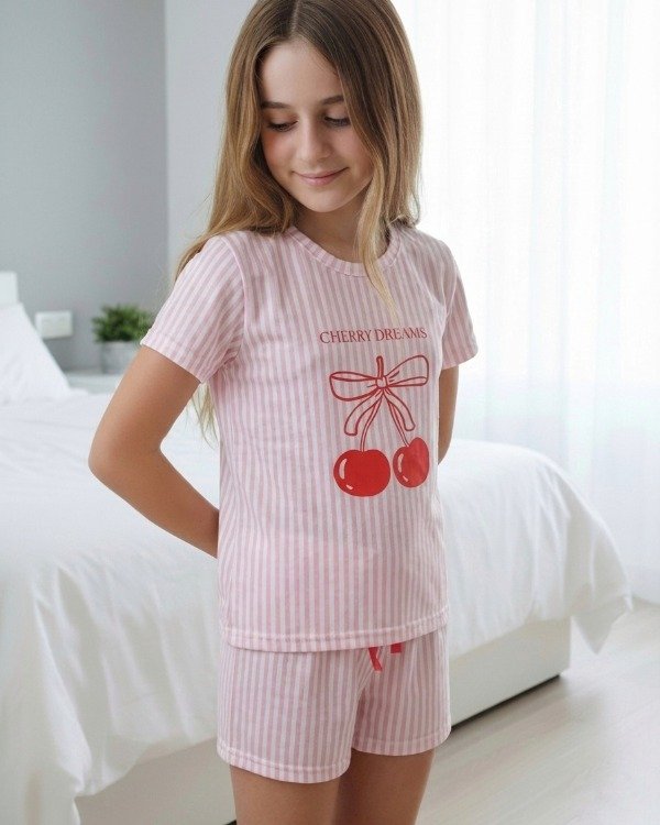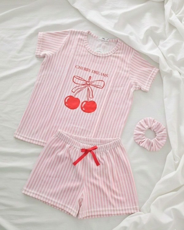 Pijama de modal importado estampa cherry dreams. Remera manga corta + short.