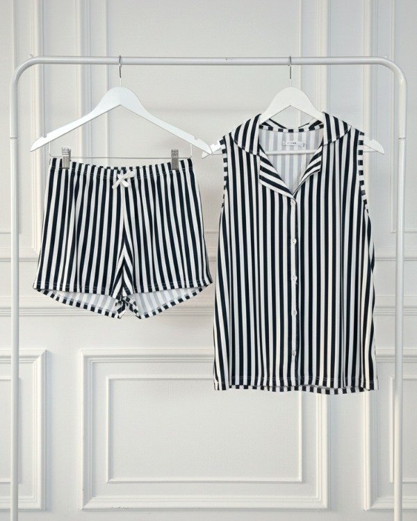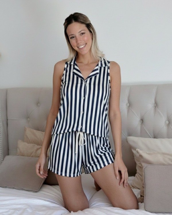 Camisero sin mangas, + short, ideal para el verano, confeccionado en modal soft, con un estampado clásico azul Marino y off white. Rayado vertical.