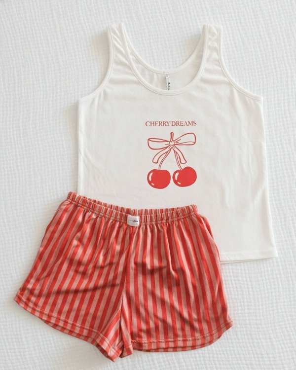 Musculosa color narural con estampado Cherry Dreams + short con bolsillos estampado rayas rojo y rosa... ideal para tus momentos de relax. Confeccionado la remera en algodón y el short modal soft.