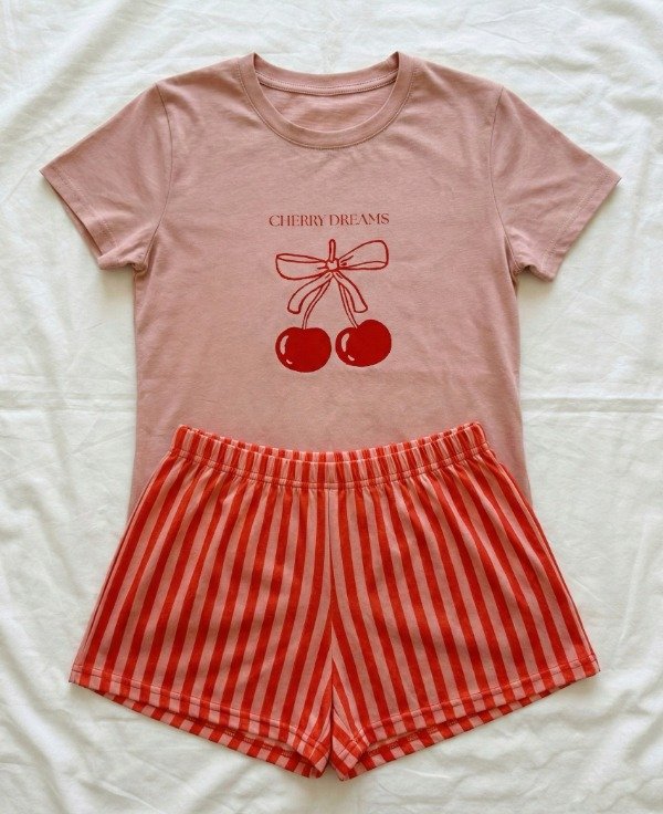 Remera color Rosa con estampado Cherry Dreams + short con bolsillos estampado rayas rojo y rosa... ideal para tus momentos de relax. Confeccionado todo en Modal Soft la remera y el short.